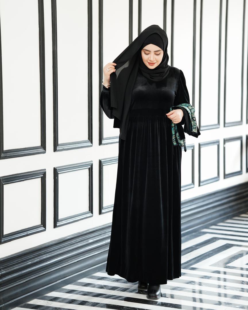 • جنس پارچه :کرپ الیزه لوکس (دو دور رنگ شده . جت بلک)
